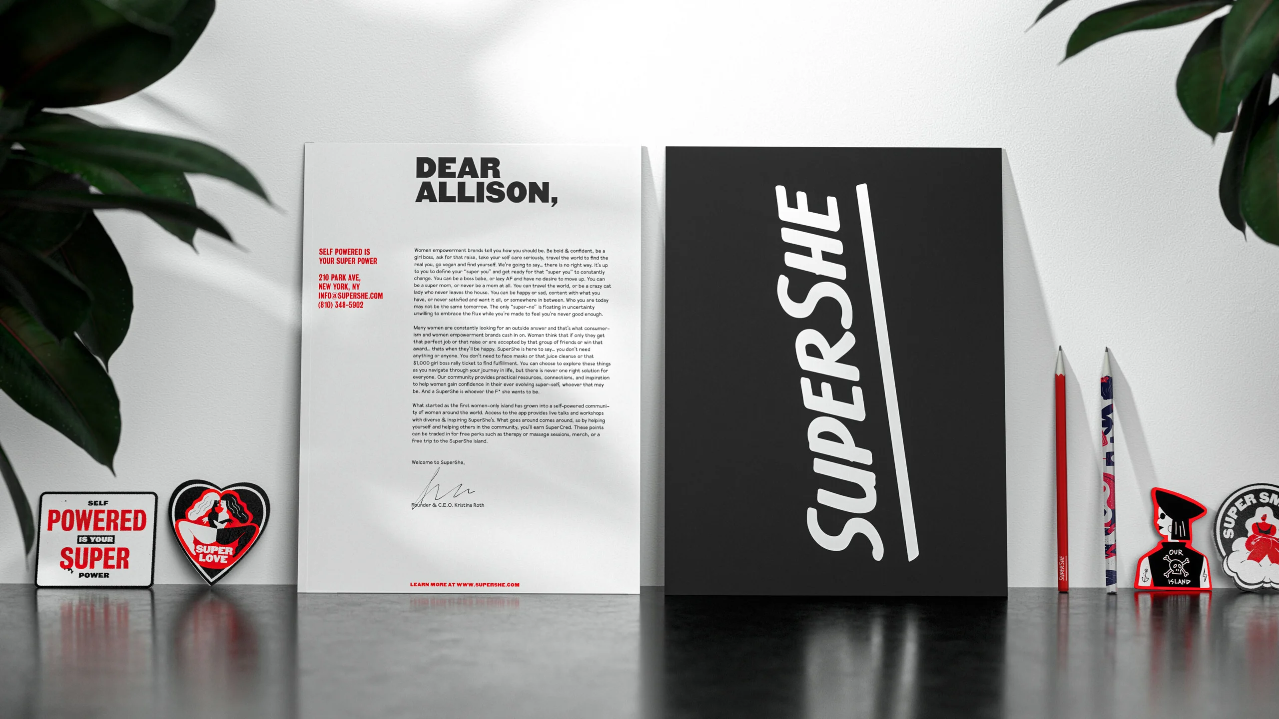 SuperShe started as a women’s only private island — a place where women could find community, form bonds & lift each other up. Quickly, SuperShe’s founder realized that a private island would be inaccessible to many women who want & need the community. So, she decided to bring the community onto an app. We created the branding, strategy & merch for the SuperShe brand.